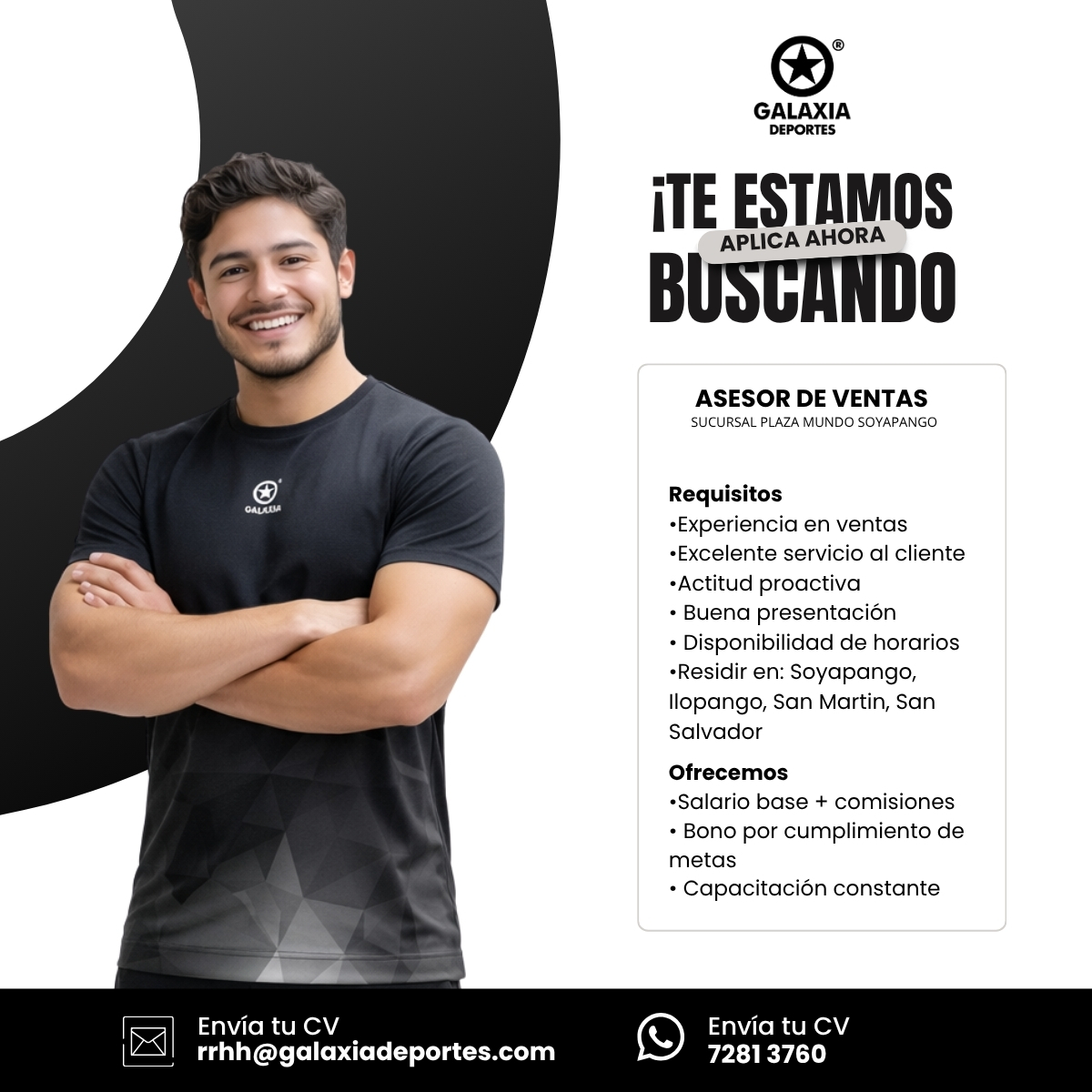 Buscamos candidatos con actitud proactiva, habilidades de comunicación, buena presentación y disponibilidad de horarios, preferiblemente residentes en zonas cercanas a Soyapango, Ilopango, San Martín o San Salvador.