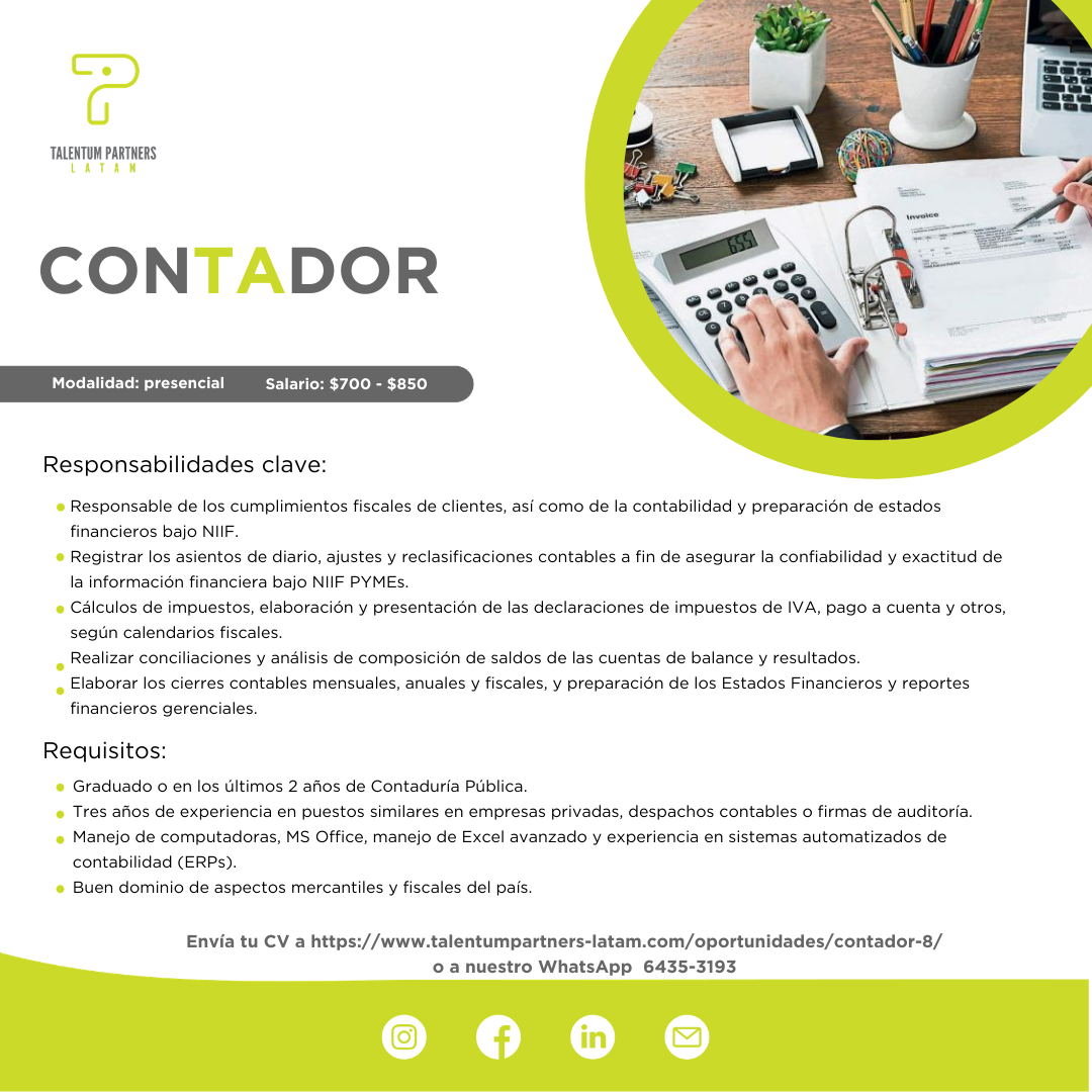 - Tres años de experiencia en puestos similares en empresas privadas, despachos contables o firmas de auditoría.